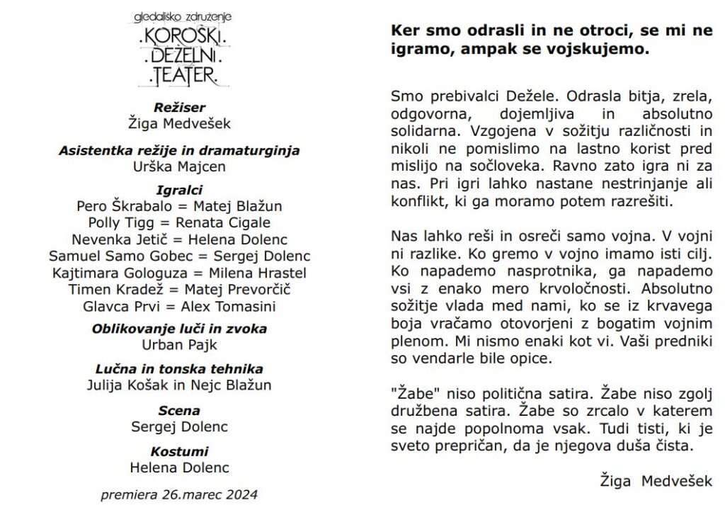 “Žabe” niso politična satira. Žabe niso zgolj družbena satira. Žabe so zrcalo, v katerem se najde popolnoma vsak. Tudi tisti, ki je sveto prepričan, da je njegova duša čista.